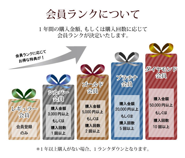| ゴールド | 過去12ヶ月購入金額5千円以上 または購入回数2回以上 |