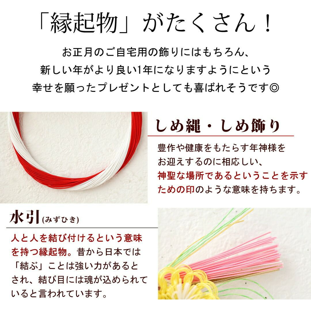 他の画像を見る 福を呼び込み、実りを願う♪ 正月飾り 2026 新作 しめ飾り 迎春飾り 選べる2種類 [12/15~31届] 送料無料 年末お届け限定 当店特別価格 ¥ 7,980 税込 会員価格あり Web会員様特別価格 ¥ 7,581 税込 詳細を見る お気に入りに登録する