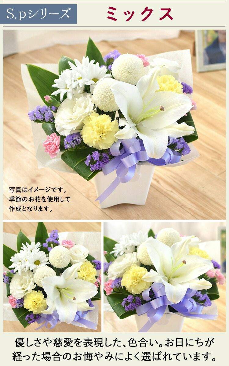 他の画像を見る お供えのフラワーアレンジメント お供え生花アレンジメント S.pシリーズ 【生花】 お盆 新盆 初盆 お彼岸 翌日配達 即日発送 送料無料 お供え用 生花アレンジ 当店特別価格 ¥ 3,980 税込 会員価格あり Web会員様特別価格 ¥ 3,781 税込 詳細を見る お気に入りに登録する