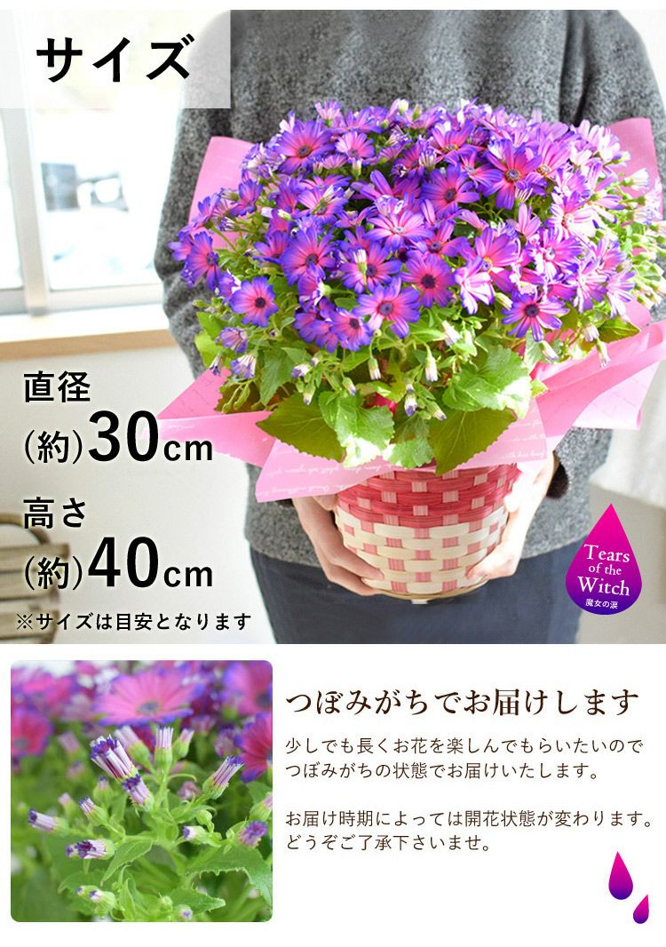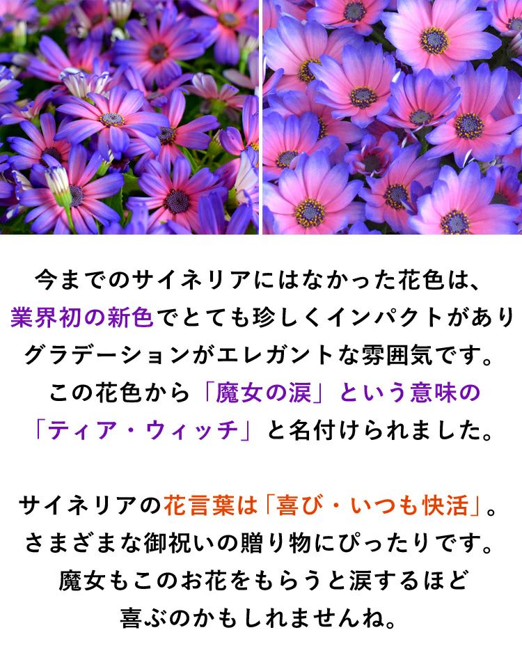 他の画像を見る 大きくて丈夫!季節の鉢花ギフト モリヒロ園芸さんの季節の鉢花 送料無料プレミアム サイネリア ティア・ウィッチ 2/8~3/14お届け 即日発送 送料無料 鉢植え 当店特別価格 ¥ 3,980 税込 会員価格あり Web会員様特別価格 ¥ 3,781 税込 在庫切れ 詳細を見る お気に入りに登録する