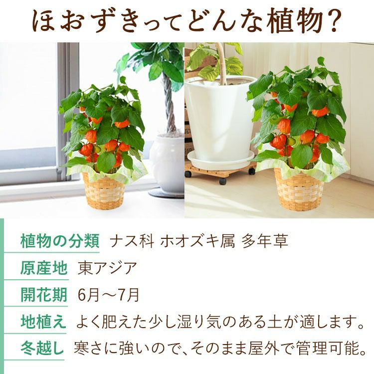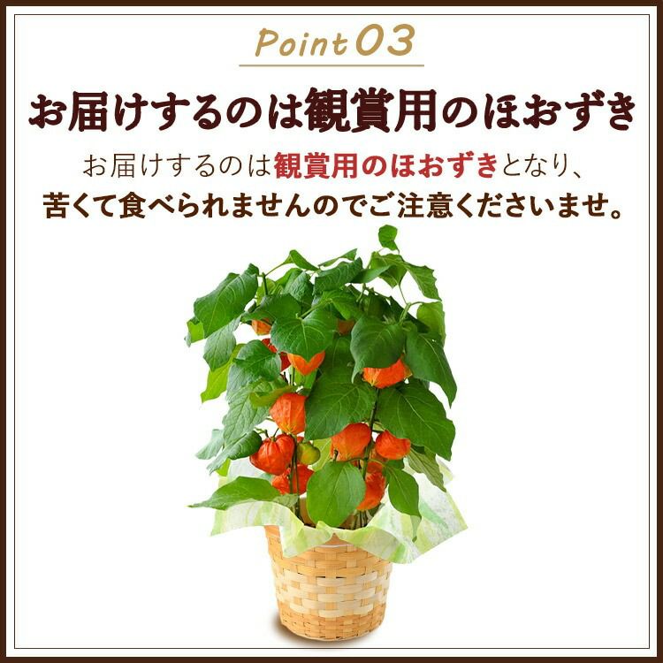 他の画像を見る 和の情趣たっぷり 夏の贈り物 夏の風物詩 鉢植え ほおずき 5号鉢 in バスケット <6/18~7/31の間で指定OK> 送料無料 鉢植え 観葉植物 当店特別価格 ¥ 3,540 税込 会員価格あり Web会員様特別価格 ¥ 3,363 税込 販売を終了しました。 在庫切れ 詳細を見る お気に入りに登録する