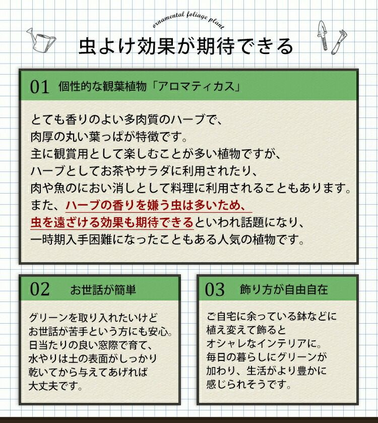 他の画像を見る ハーブのチカラで虫除け! 虫よけ 虫除けハーブ アロマティカス インテリアプランツ 観葉植物 鉢植え 観葉植物 当店特別価格 ¥ 990 税込 会員価格あり Web会員様特別価格 ¥ 940 税込 在庫切れ 詳細を見る お気に入りに登録する
