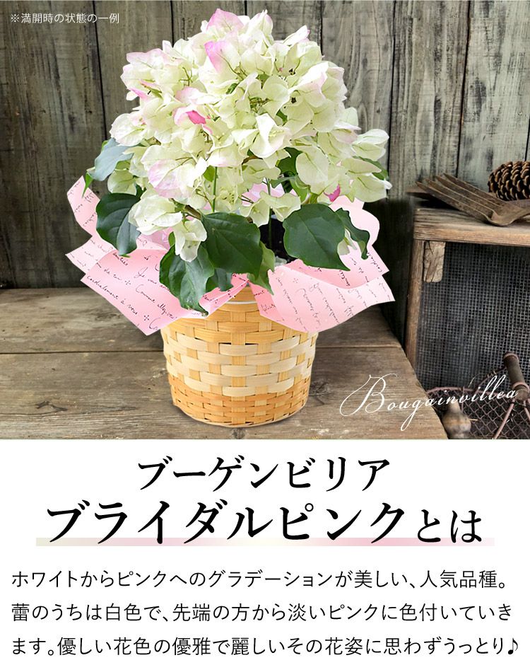 他の画像を見る これからの季節に楽しめるお花♪ 鉢植え ブーゲンビリア ブライダルピンク 5号鉢 in バスケット <~7/31の間で指定OK> 送料無料 鉢植え 当店特別価格 ¥ 4,830 税込 会員価格あり Web会員様特別価格 ¥ 4,588 税込 販売を終了しました。 在庫切れ 詳細を見る お気に入りに登録する
