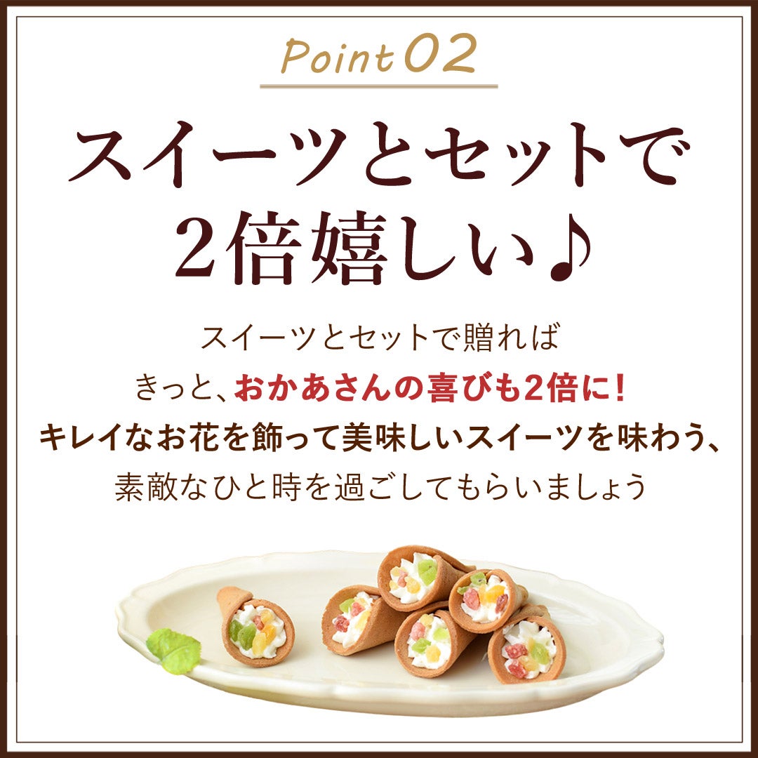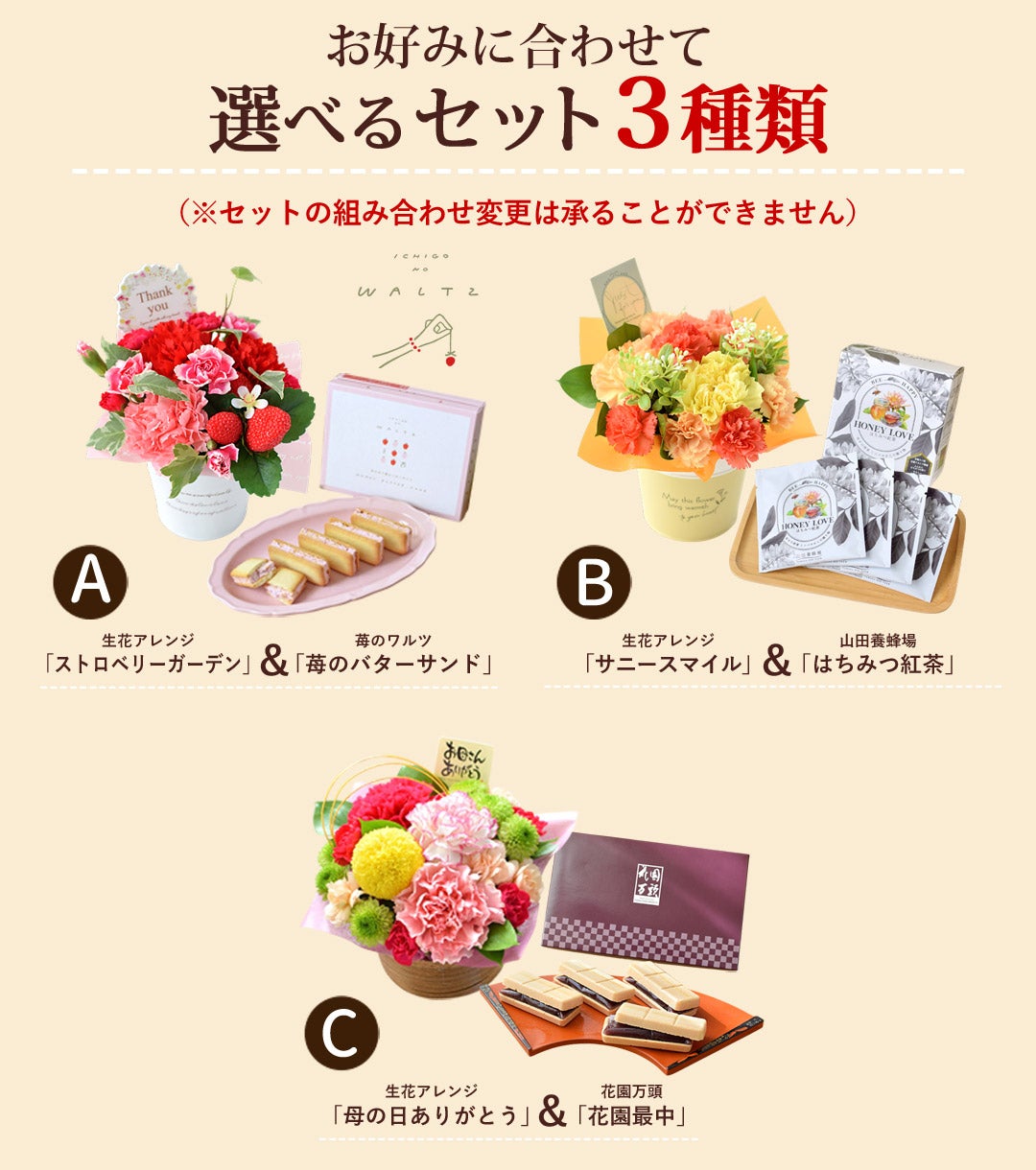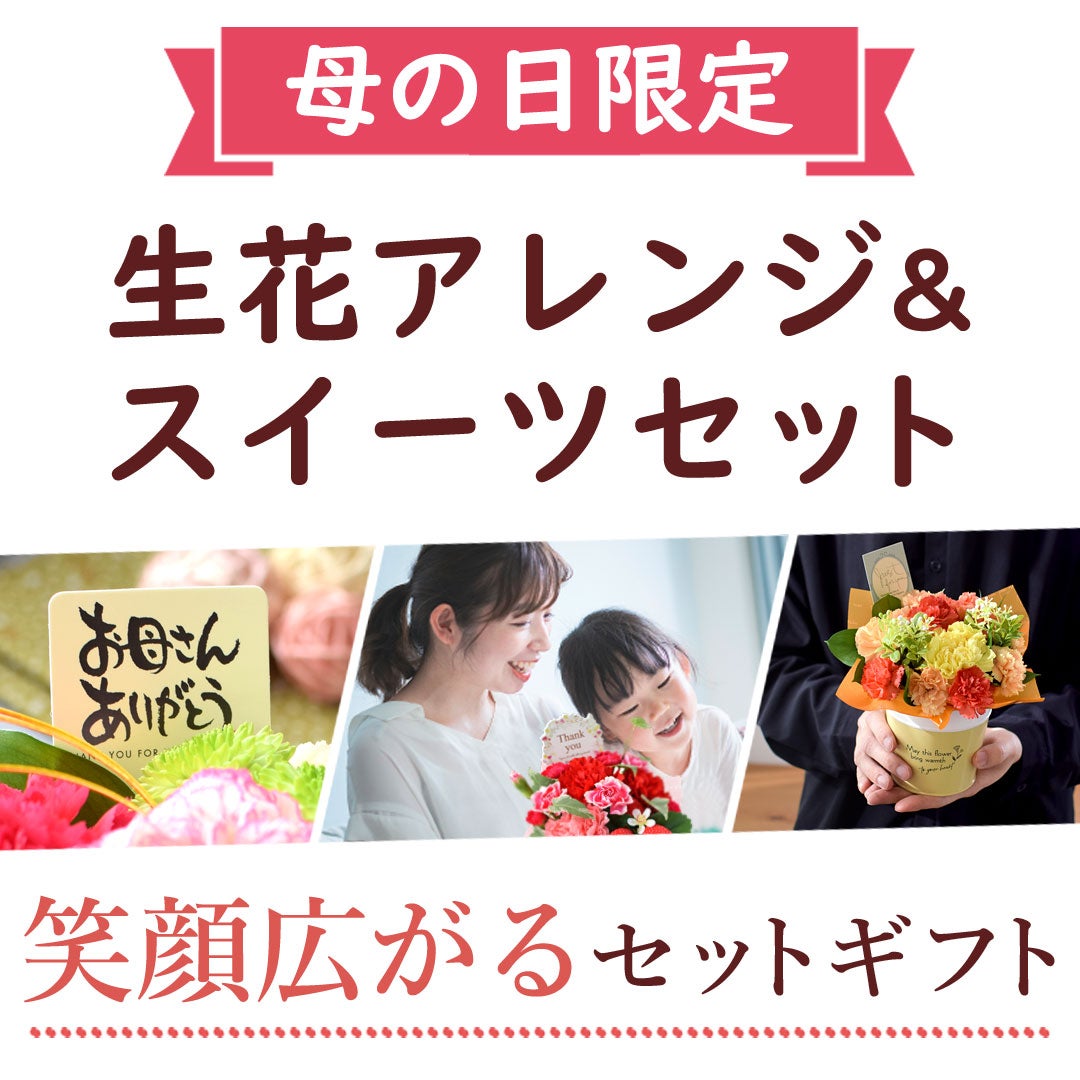 他の画像を見る 華やかなアレンジとスイーツをセットでお届け♪ 母の日 2026 花とスイーツ 生花 アレンジメント & スイーツ セット 選べる3種類 生花アレンジ 母の日期間限定 当店特別価格 ¥ 4,780 税込 詳細を見る お気に入りに登録する